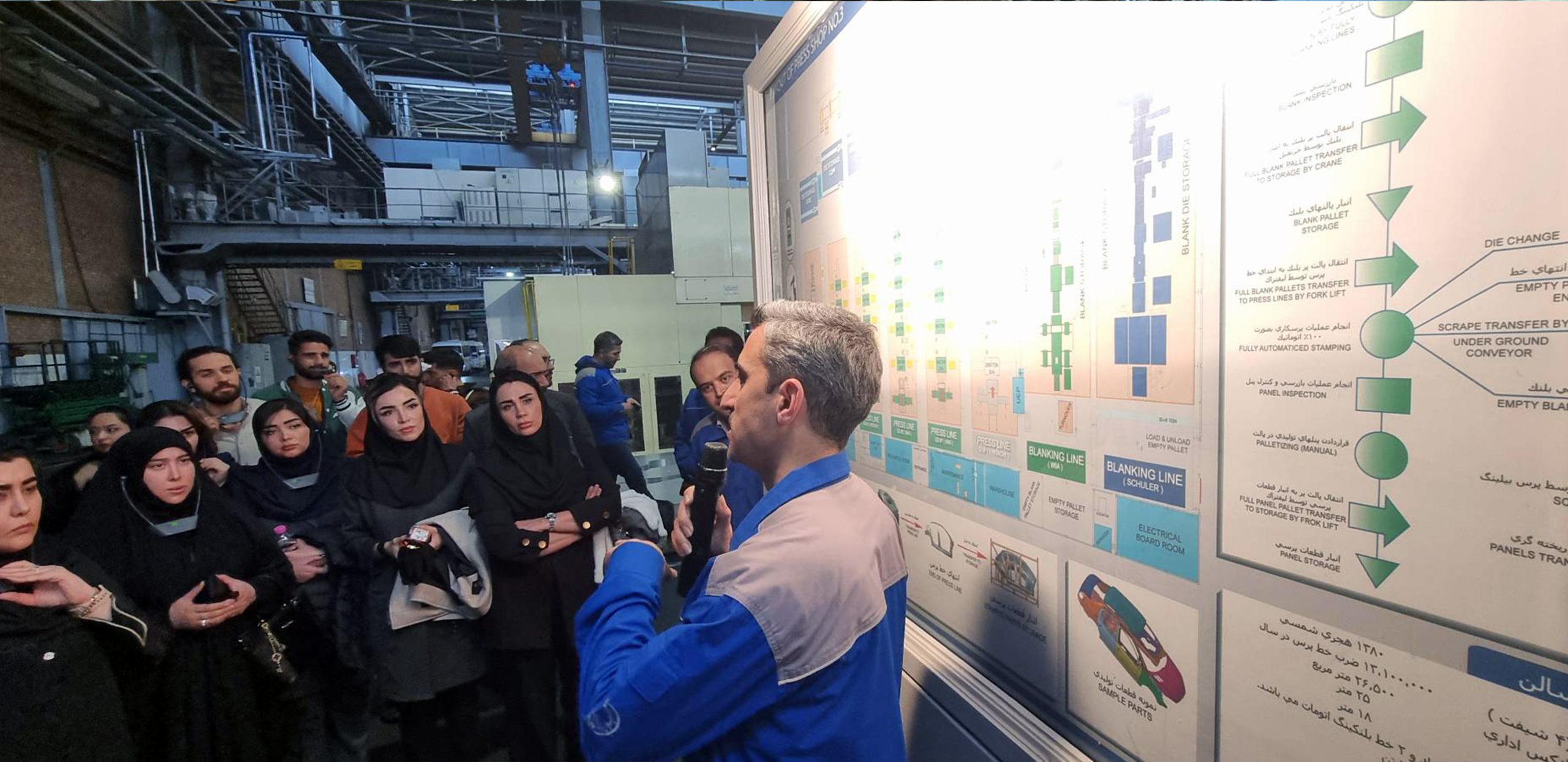 در جریان این بازدید، دانشجویان از بخشهای مختلف خطوط تولید دیدن کرده و از نزدیک با مراحل ساخت بدنه و مونتاژ خودرو آشنا شدند. در سالن پرس، کارشناسان توضیحاتی درباره فرآیند شکلدهی ورقهای فلزی و فناوریهای جدید مورد استفاده در تولید ورقهای پیشرفته ارائه نمودند. در این بخش، بهطور ویژه به فرآیند تولید ورقهای دولایه مورد استفاده در محصولات جدید این شرکت از جمله خودروهای ریرا و تارا اشاره شد. این ورقها با بهرهگیری از روشهای نوین تولید، از استحکام و کیفیت بالاتری برخوردار بوده و نقش مهمی در افزایش ایمنی و دوام خودروها دارند. توضیحات تخصصی کارشناسان و مشاهده مستقیم این فرآیند، درک عمیقتری از فناوریهای نوین صنعت خودروسازی برای دانشجویان فراهم کرد.