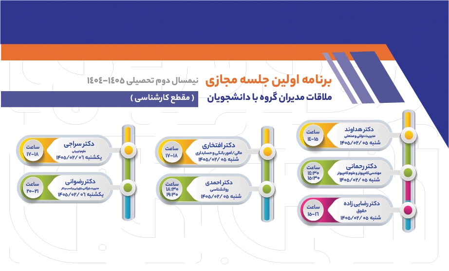 - آقای دکتر افتخاری | شنبه ۱۴۰۵/۰۲/۰۵ ساعت ۱۷:۰۰- ۱۸:۰۰