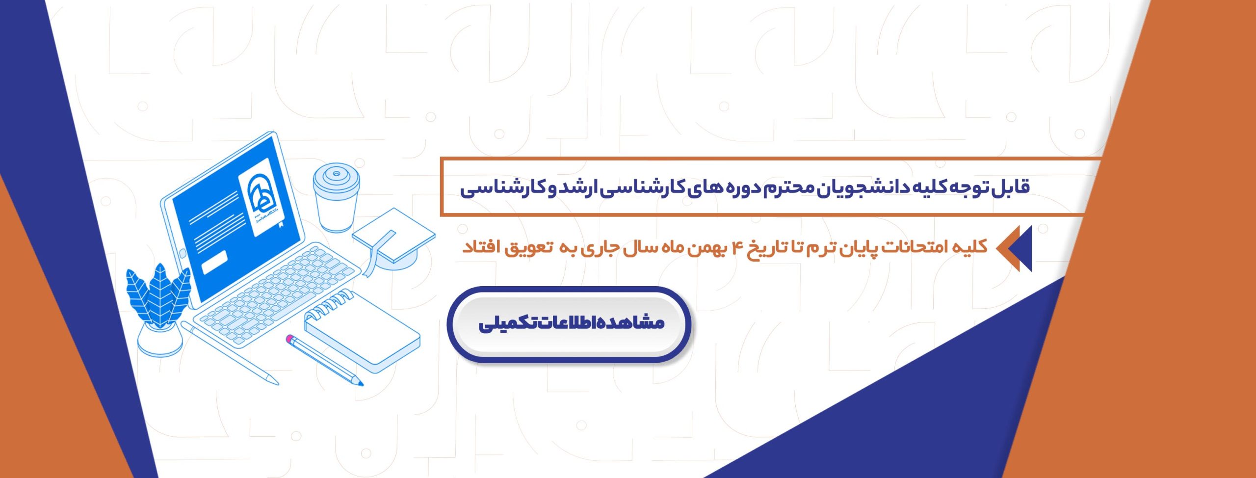 لازم به ذکر است امتحانات برگزار شده مورخ ۱۴۰۴/۱۰/۱۹ برای آن عده از دانشجویان که به علت کندی اینترنت موفق به شرکت در امتحان نشدند مجددا در تاریخ ۱۴۰۴/۱۱/۴ برگزار خواهد شد.